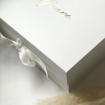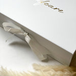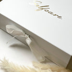 Diese exclusive, weisse Magnetbox hat eine weisse Schleife und natürlich den super schönen, goldenen Aufkleber „Selfcare“.