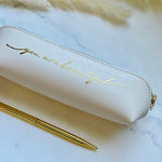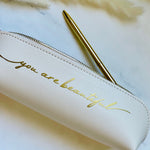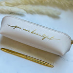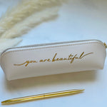 Mit dem Stiftemäppchen mit goldenem Reißverschluss in Altweiss findet alles einen Platz. Passend zu dem Stifteset kannst du darin all deine Stifte aufbewahren und nichts geht verloren. Auf dem Mäppchen prankt ein goldener Spruch, den du dir immer zu Herzen nehmen solltest. „you are beautiful“. Jeder einzelne von uns ist wunderschön, so wie er ist. Leider vergessen wir das immer wieder und dieses Stiftemäppchen ist ein kleiner reminder für dich, dass du das niemals vergisst. Du kannst es natürlich auch als kleine Kosmetiktasche benutzen und gut auf Reisen mitnehmen. Verschenke es auch an einen lieben Menchen, der sich auch immer daran erinnern soll, wie wunderschön er ist.